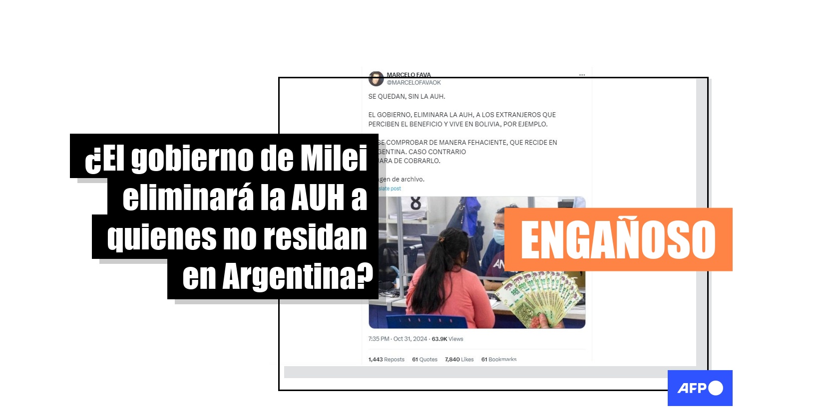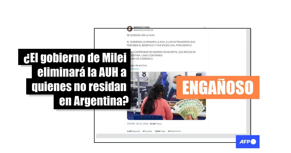 “EL GOBIERNO, ELIMINARA LA AUH, A LOS EXTRANJEROS QUE PERCIBEN EL BENEFICIO Y VIVE EN BOLIVIA, POR EJEMPLO” anuncian usuarios en X y Facebook. “DEBE COMPROBAR DE MANERA FEHACIENTE, QUE RECIDE EN ARGENTINA. CASO CONTRARIO DEJARA DE COBRARLO”.
