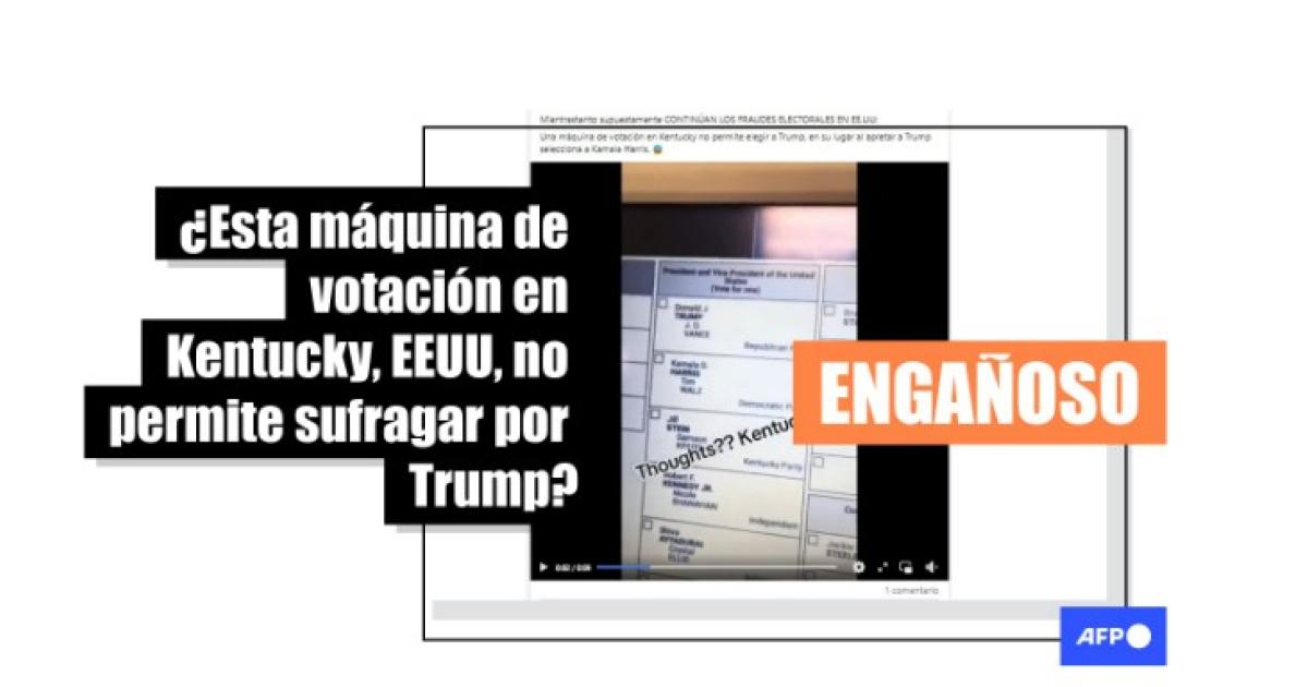 “URGENTE: Las máquinas de votación electrónicas en Kentucky ¡NO PERMITEN que los votantes seleccionen el nombre de Donald Trump al votar”, señalan usuarios en Facebook y X que comparten un video en el que se ve a una persona intentando seleccionar el nombre de Trump sin éxito en una máquina de votación, tras lo cual selecciona el de Harris.