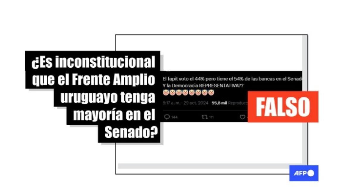 “El fapit voto el 44% pero tiene el 54% de las bancas en el Senado. Y la Democracia REPRESENTATIVA??”, cuestiona una publicación en X, cuya captura de pantalla circula también en Facebook. “FAPIT” es una forma despectiva de llamar al FA.