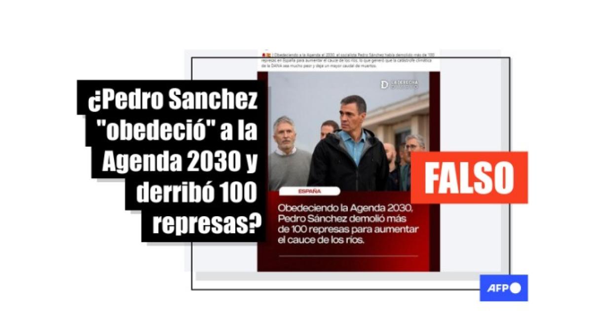 “Obedeciendo a la Agenda el 2030, el socialista Pedro Sánchez había demolido más de 100 represas en España para aumentar el cauce de los ríos, lo que generó que la catástrofe climática de la DANA sea mucho peor y deje un mayor caudal de muertos”, se lee en una publicación en Facebook. Afirmaciones similares circulan en X, Instagram y Threads.