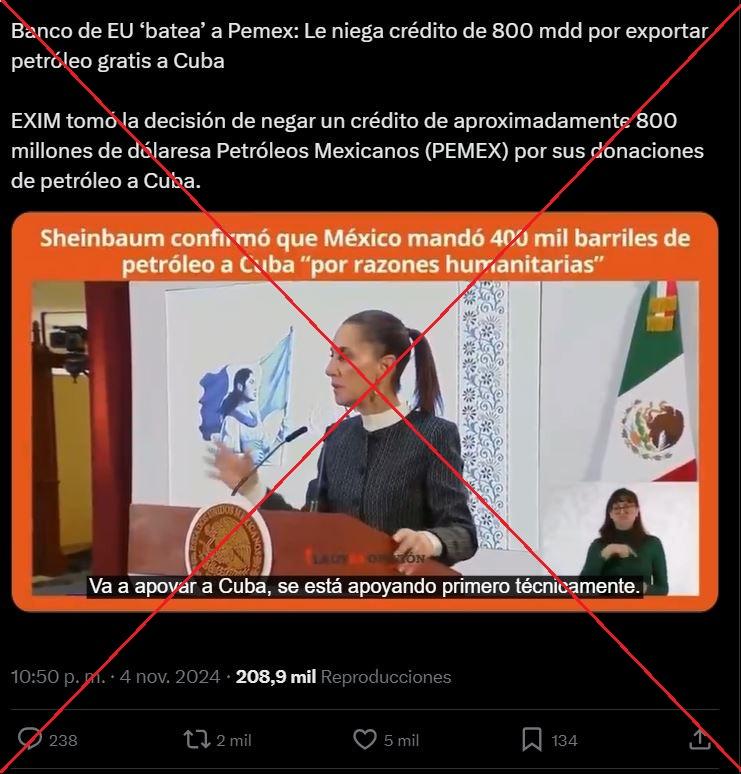 La presidenta de México, Claudia Sheinbaum, informó a finales de octubre de 2024 que Petróleos Mexicanos (Pemex) donó 400.000 barriles de petróleo a Cuba como apoyo en su crisis energética. Desde entonces, publicaciones compartidas miles de veces en redes sociales afirman que el Banco de Exportación e Importación de Estados Unidos (Exim) negó un crédito a Pemex por exportar crudo gratis a la isla. Pero eso es falso. Las entradas se basan en una supuesta noticia de 2023, cuando Exim aclaró a la AFP que no canceló ningún crédito a Pemex y que dar ayuda humanitaria a Cuba no es un obstáculo para pedir préstamos.