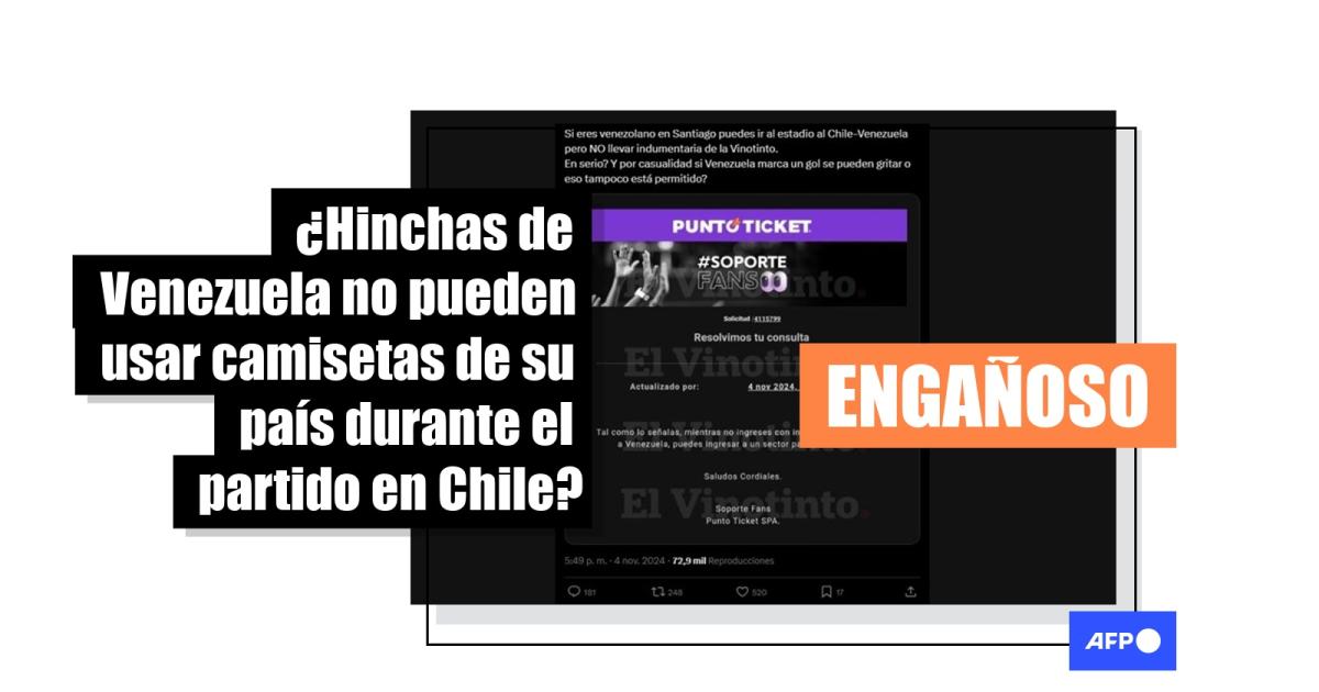 “Si eres venezolano en Santiago puedes ir al estadio al Chile-Venezuela pero NO llevar indumentaria de la Vinotinto. En serio? Y por casualidad si Venezuela marca un gol se pueden gritar o eso tampoco está permitido?”, afirman publicaciones en Facebook, Instagram, X y Threads acompañadas de una captura de pantalla de un mensaje de la empresa Puntoticket, encargada de la venta de boletería de la selección chilena.