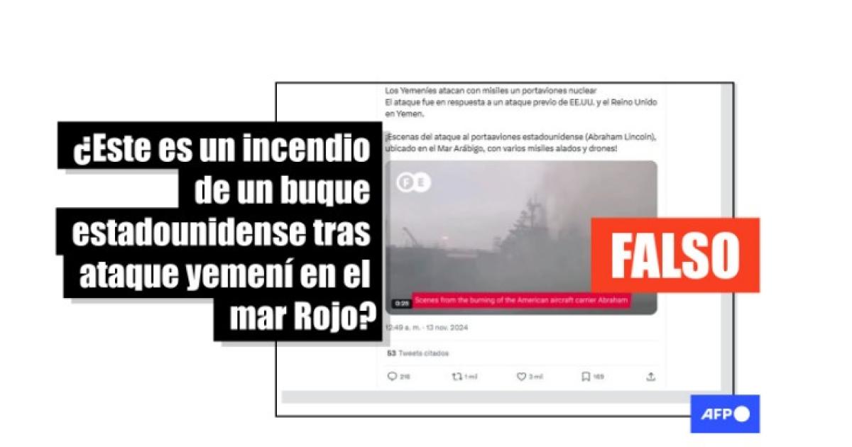 “Los Yemeníes atacan con misiles un portaviones nuclear. El ataque fue en respuesta a un ataque previo de EE.UU. y el Reino Unido en Yemen. ¡Escenas del ataque al portaaviones estadounidense (Abraham Lincoln), ubicado en el Mar Arábigo, con varios misiles alados y drones!”, dice una publicación compartida en X y Facebook.