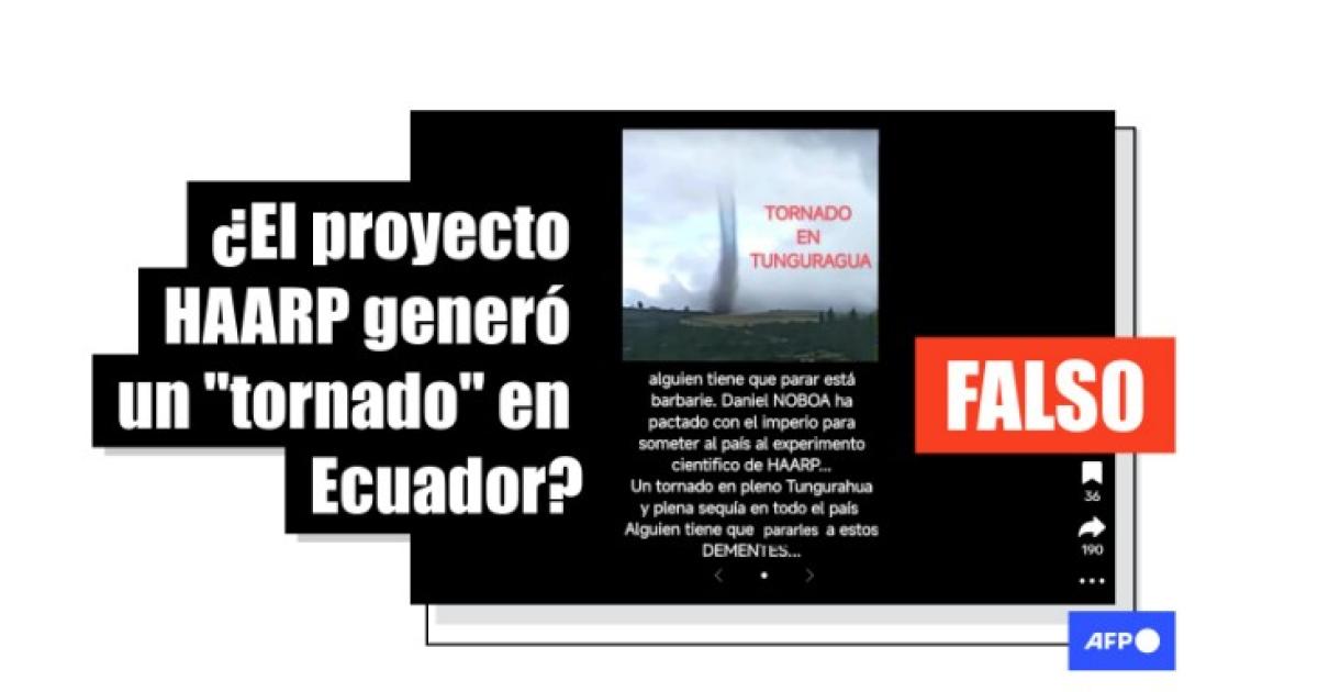 “TORNADO EN TUNGURAGUA. Alguien tiene que parar está barbarie. Daniel NOBOA ha pactado con el imperio para someter al país al experimento cientifico de HAARP”, se lee en publicaciones compartidas en Facebook y TikTok. “Un tornado en pleno Tungurahua y plena sequía en todo el país. Alguien tiene que pagarles a estos DEMENTES”, concluyen las publicaciones.