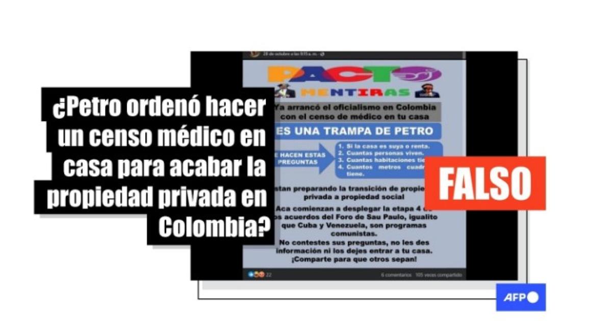 “Ya arrancó el oficialismo en Colombia con el censo médico en tu casa es una trampa de Petro. Te hacen estas preguntas 1. Si la casa es suya o renta, 2. cuántas personas viven, 3.cuántas habitaciones tiene, 4. cuántos metros cuadrados tiene”, dice la pieza compartida en Facebook (1, 2).