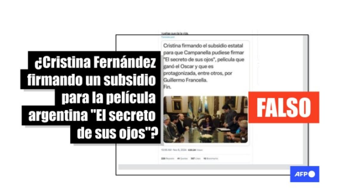 “Vueltas que da la vida”, escribe un usuario en X que adjunta una captura con la inscripción: “Cristina firmando el subsidio estatal para que Campanella pudiese firmar ‘El secreto de sus ojos’, película que ganó el Oscar y que es protagonizada, entre otros, por Guillermo Francella”. En la imagen se ve a Fernández firmando un documento junto a Campanella. El contenido también circula en Facebook, Instagram y Threads.