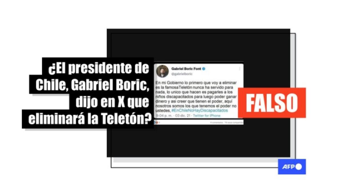 “En mi Gobierno lo primero que voy a eliminar es la famosa Teletón nunca ha servido para nada, lo unico que hacen es pagarles a los niños discapacitados para luego poder ganar dinero y asi creer que tienen el poder, aquí nosotros somos los que tenemos el poder no ustedes”, señala un supuesto mensaje que culmina con la etiqueta #EnChileNoHayDiscapacitados, que habría sido publicado por Boric en diciembre de 2021, cuando era candidato a presidente.