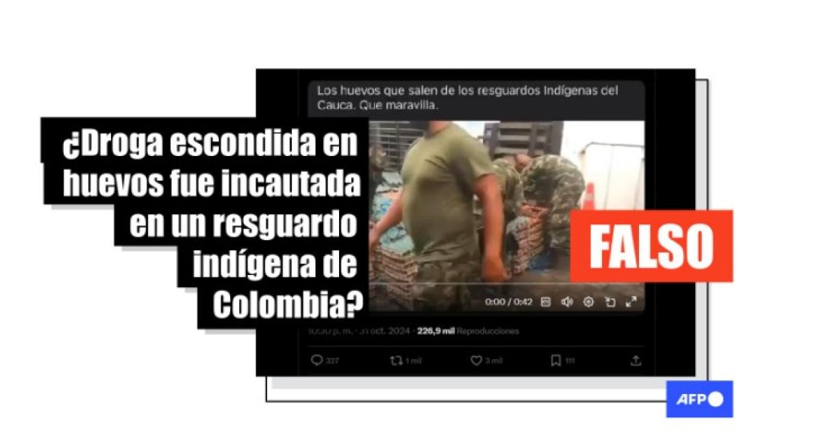 En el video, que circula en X y Facebook, se ve a un grupo de soldados sacando paquetes escondidos entre varias canastas de huevos. En un texto sobreimpreso se lee: “Los huevos que salen de los resguardos Indígenas del Cauca. Que maravilla”.