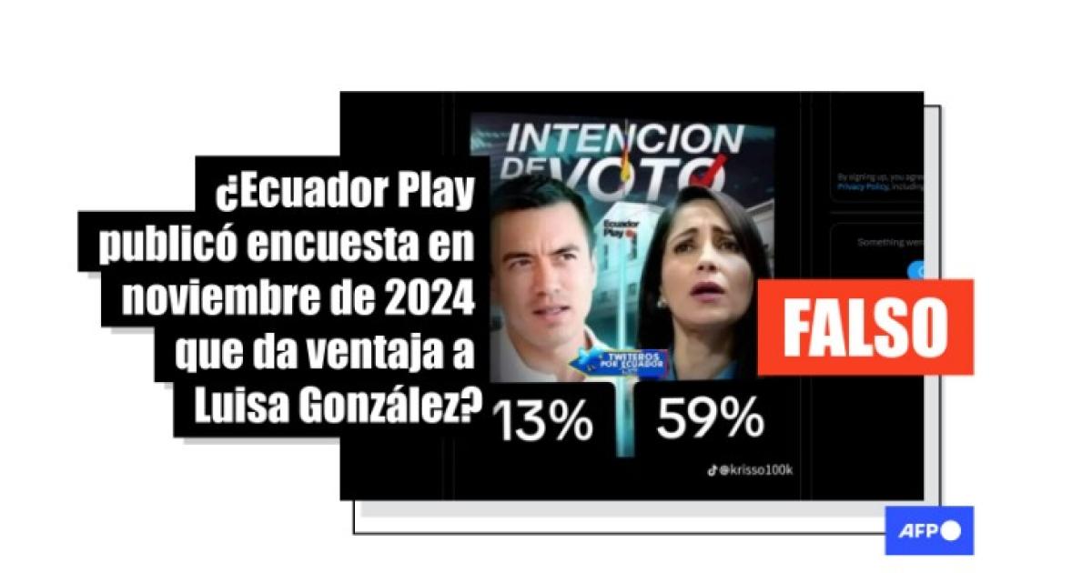 La supuesta encuesta, que circula en Facebook, X y TikTok con un logo de Ecuador Play, muestra un 13% de intención de voto para Noboa, actual presidente y candidato del Movimiento Acción Democrática Nacional, y un 59% para González, candidata del Movimiento Revolución Ciudadana.