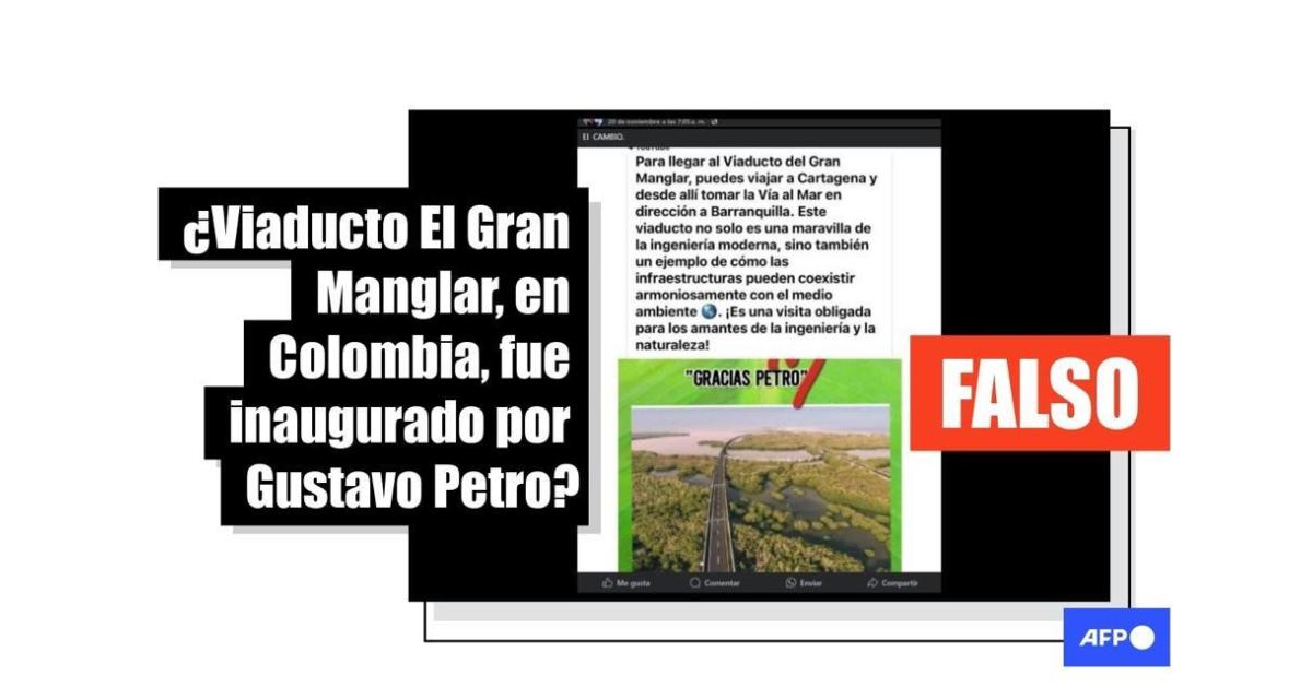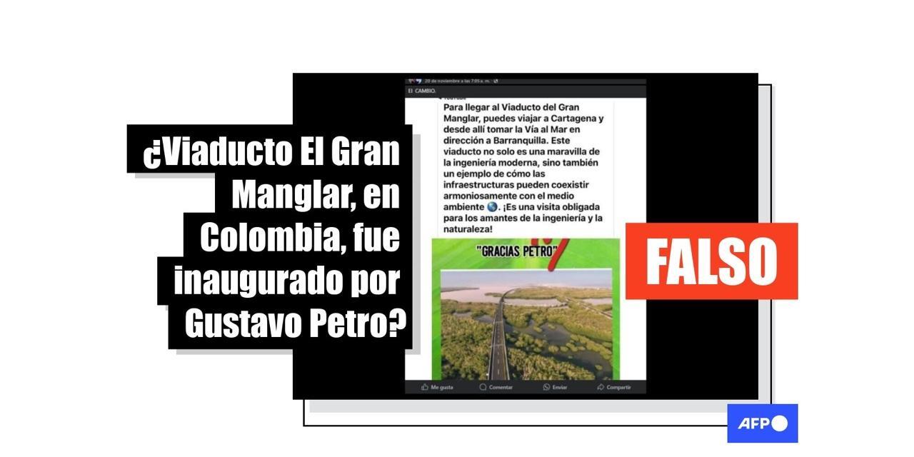 Tres fotografías del viaducto El Gran Manglar, ubicado en el norte de Colombia, se comparten cientos de veces en redes sociales desde noviembre de 2024 con un texto que atribuye la obra al gobierno del actual presidente, Gustavo Petro, que asumió en agosto de 2022. Sin embargo, el proyecto inició en 2014 y fue entregado en 2018 por el exmandatario Juan Manuel Santos (2010-2018).