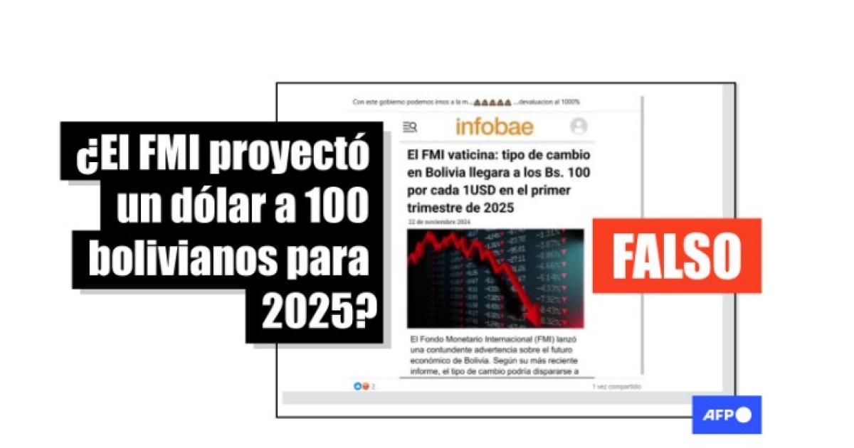 “El FMI vaticina: tipo de cambio en Bolivia llegara a los Bs. 100 por cada 1 USD en el primer trimestre de 2025”, titula una supuesta nota de Infobae fechada el 22 de noviembre de 2024 y compartida en Facebook.