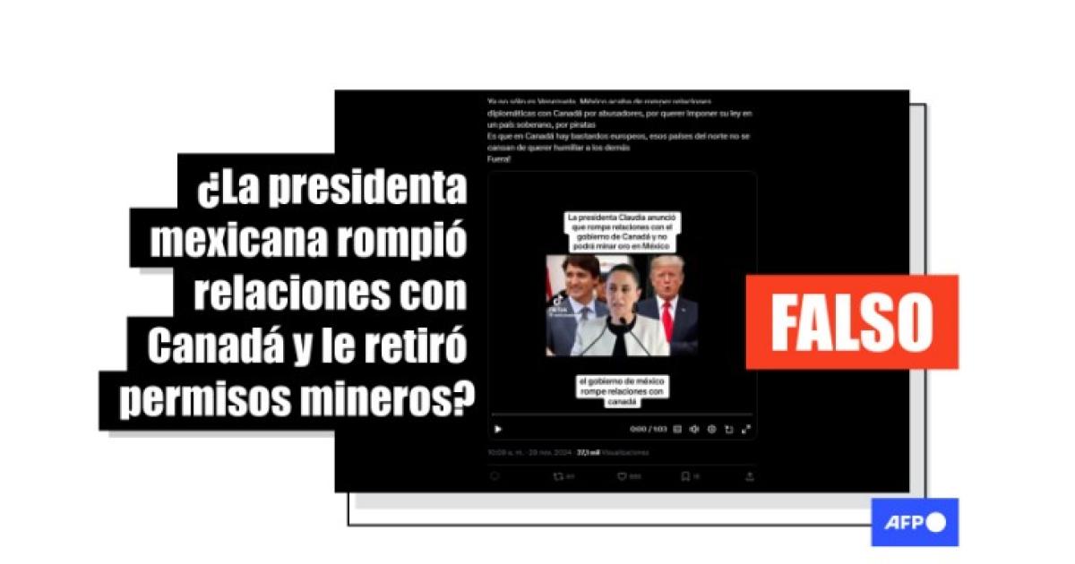 “El gobierno de méxico rompe relaciones con canadá y le retira el permiso para que continúe minando oro y minerales en el país”, se anuncia en un video que circula en X, Facebook y TikTok. Según el contenido, la mandataria informó sobre tales medidas en una de sus conferencias matutinas, llamadas “mañaneras”.