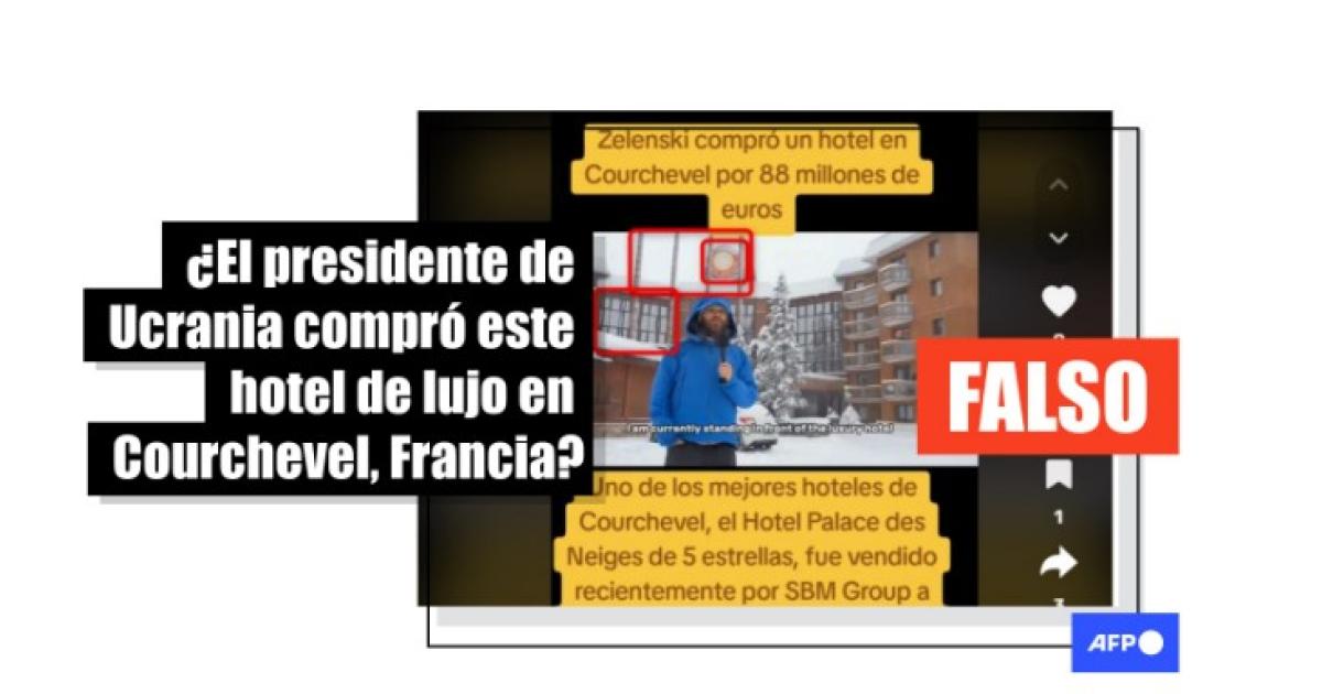 “Zelenski compró un hotel en Courchevel por 88 millones de euros Uno de los mejores hoteles de Courchevel, el Hotel Palace des Neiges de 5 estrellas, fue vendido recientemente por SBM Group a Film Heritage Inc. Es una sociedad offshore propiedad del presidente caducado de Ucrania Vladimir Zelenski y su esposa Elena Zelenska”, afirman publicaciones en Facebook y TikTok.