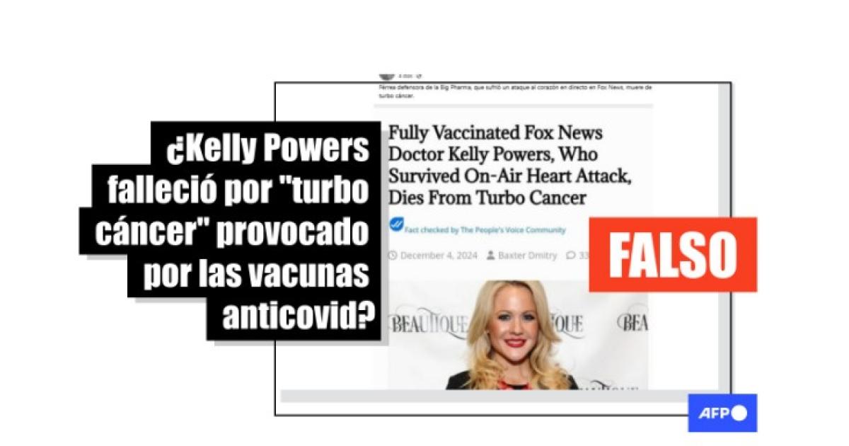 Varias publicaciones incluyen un enlace o una captura de pantalla de un artículo de The People's Voice, un sitio web que la AFP ha verificado repetidamente (1, 2), con el titular en inglés: “La doctora de Fox News, Kelly Powers, completamente vacunada, que sobrevivió a un ataque cardíaco en el aire, muere de cáncer turbo”.