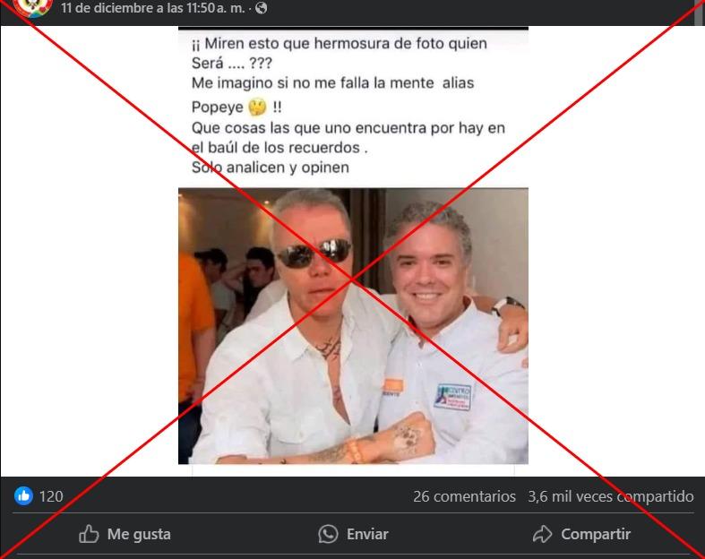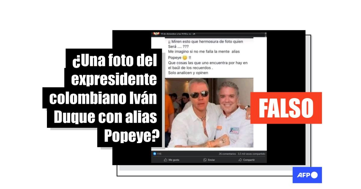 Una foto del expresidente colombiano Iván Duque (2018-2022) abrazando al exsicario Jhon Jairo Velásquez, conocido como Popeye, está alterada. La imagen se ha compartido más de 3.600 veces en redes sociales desde el 11 de diciembre de 2024. En realidad, un retrato del exmandatario con el cantante de vallenato Silvestre Dangond, en 2019, fue manipulado para incluir el rostro del fallecido criminal, mano derecha del extinto capo Pablo Escobar.