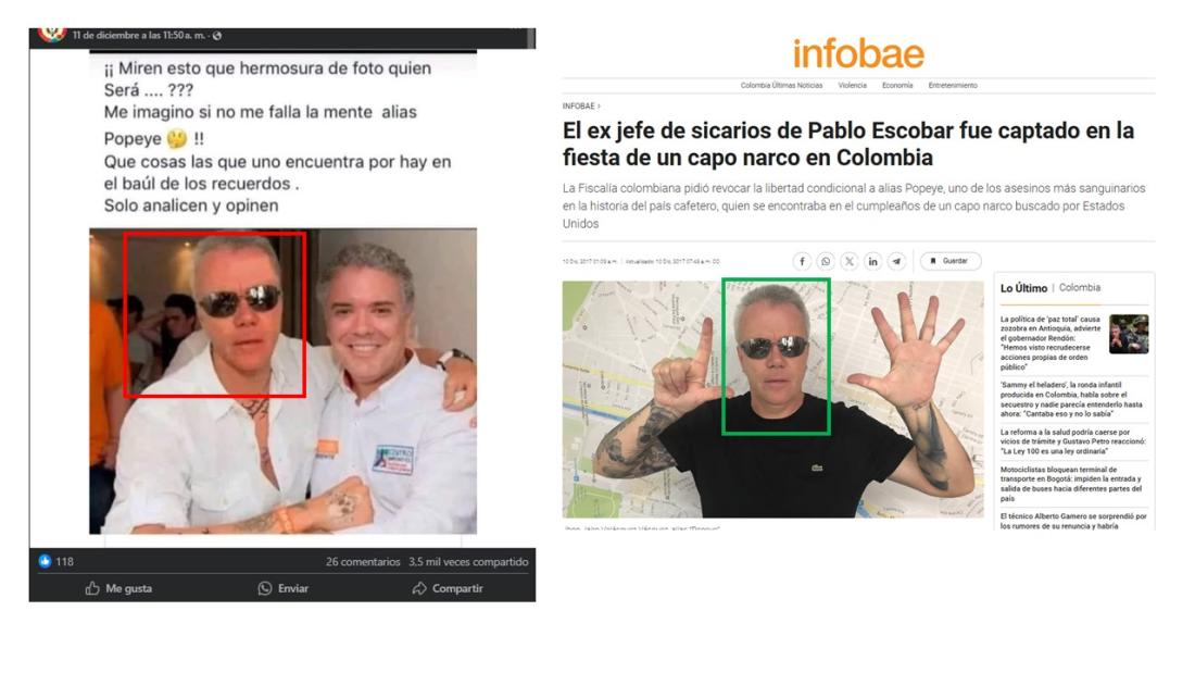Una comparación entre la entrada viral y la publicación en el perfil de Duque permitió detallar que la cara del exsicario Popeye fue agregada a la foto original, al igual que los tatuajes en el pecho y en la mano. Por otro lado, el tatuaje de la muñeca es el mismo.