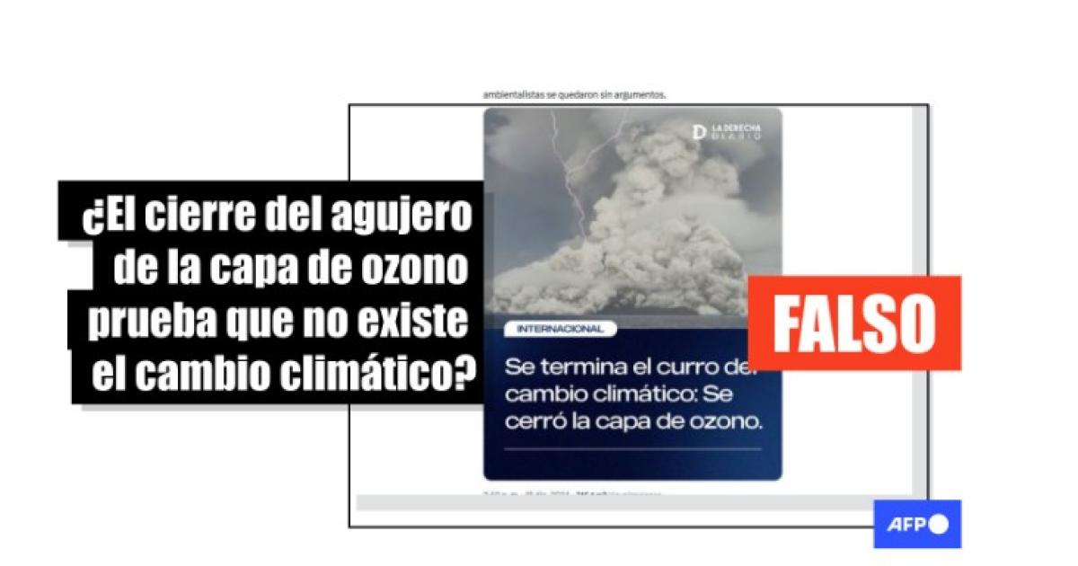 “Se termina el curro del cambio climático: Se cerró la capa de ozono”, se lee en una placa del medio argentino Derecha Diario compartida en X, Facebook e Instagram.