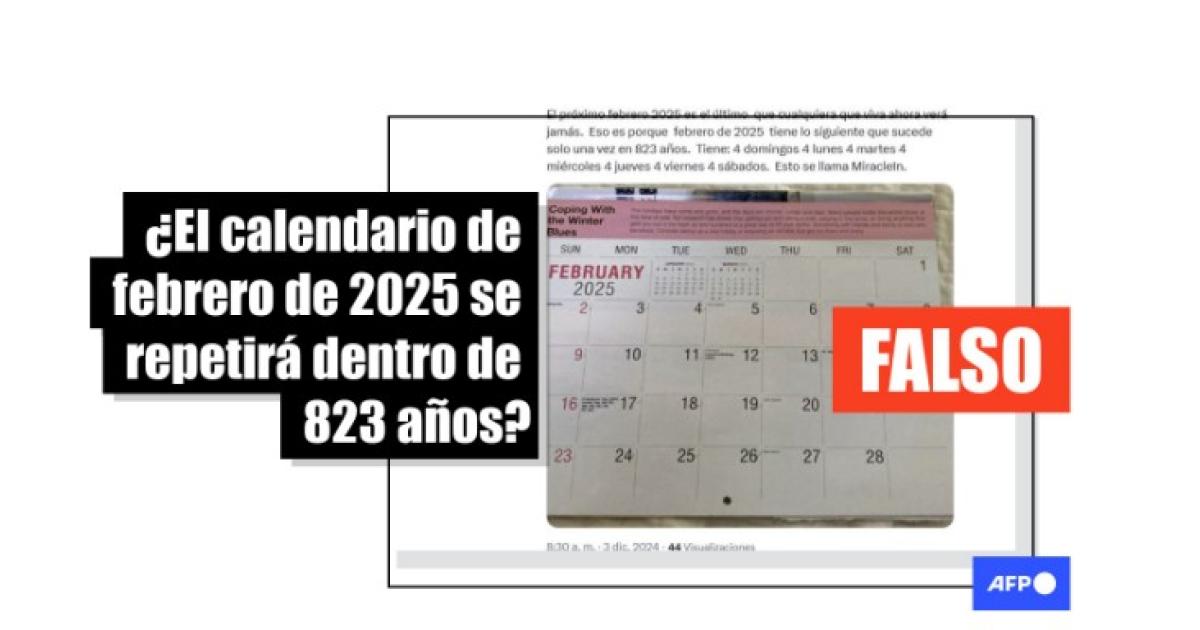 “El próximo febrero 2025 es el último que cualquiera que viva ahora verá jamás. Eso es porque febrero de 2025 tiene lo siguiente que sucede solo una vez en 823 años. Tiene: 4 domingos 4 lunes 4 martes 4 miércoles 4 jueves 4 viernes 4 sábados. Esto se llama MiracleIn”, se lee en publicaciones compartidas en X, Facebook e Instagram.