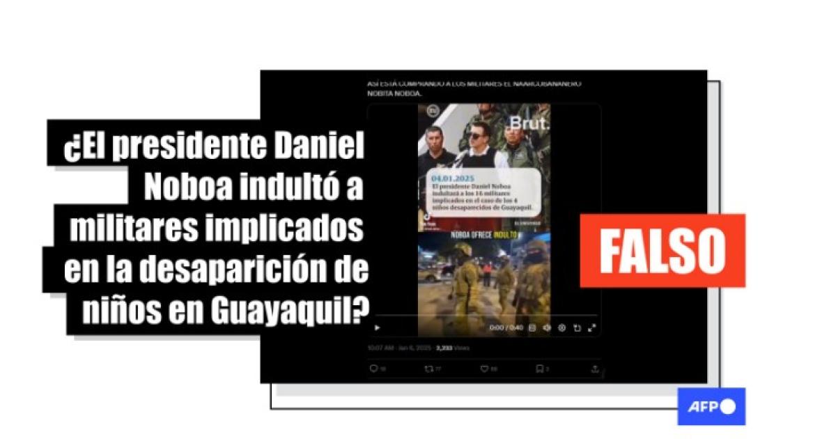 “Daniel Noboa indultará a los 16 militares implicados en el caso de los 4 niños desaparecidos en Guayaquil”, dice un texto escrito sobre la secuencia, que usa los distintivos del diario ecuatoriano El Universo.