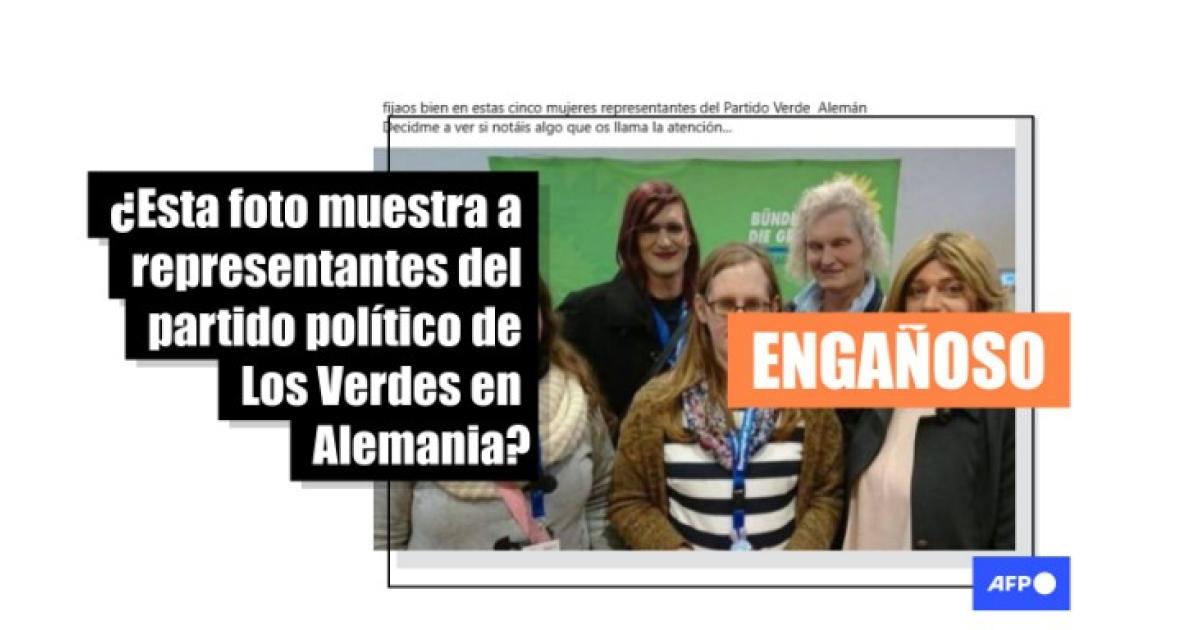 Una fotografía compartida en Facebook muestra a cinco personas posando delante de un cartel verde de Alianza 90/Los Verdes. La imagen circula junto al mensaje: “Estas cinco ‘señoritas’, son representantes del Partido Verde alemán. Si ponen a una más ya tienen la docena de huevos”.