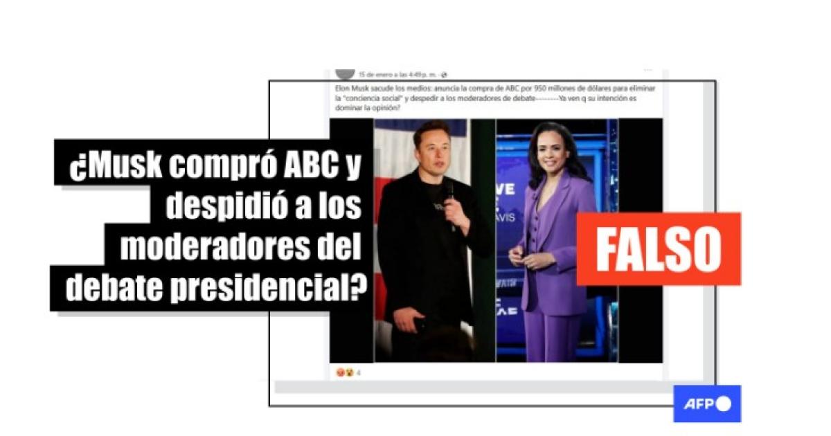 “Elon Musk sacude los medios: anuncia la compra de ABC por 950 millones de dólares para eliminar la ´conciencia social´ y despedir a los moderadores de debate”, señalan entradas en Facebook (1, 2).