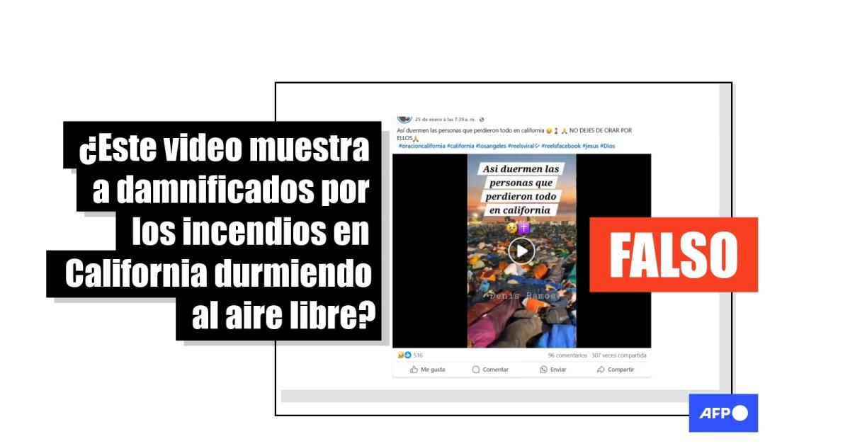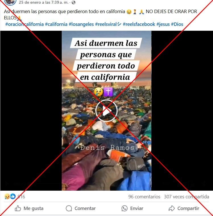 Los incendios forestales ocurridos en Los Ángeles a inicios de enero de 2025 obligaron a decenas de miles de personas a evacuar sus hogares. En ese marco, usuarios compartieron más de 300 veces en redes sociales el video de una multitud durmiendo en un campo al aire libre como si mostrara a los damnificados del desastre, que dejó casi 30 víctimas mortales. Pero la secuencia muestra un evento católico celebrado en Portugal en agosto de 2023.