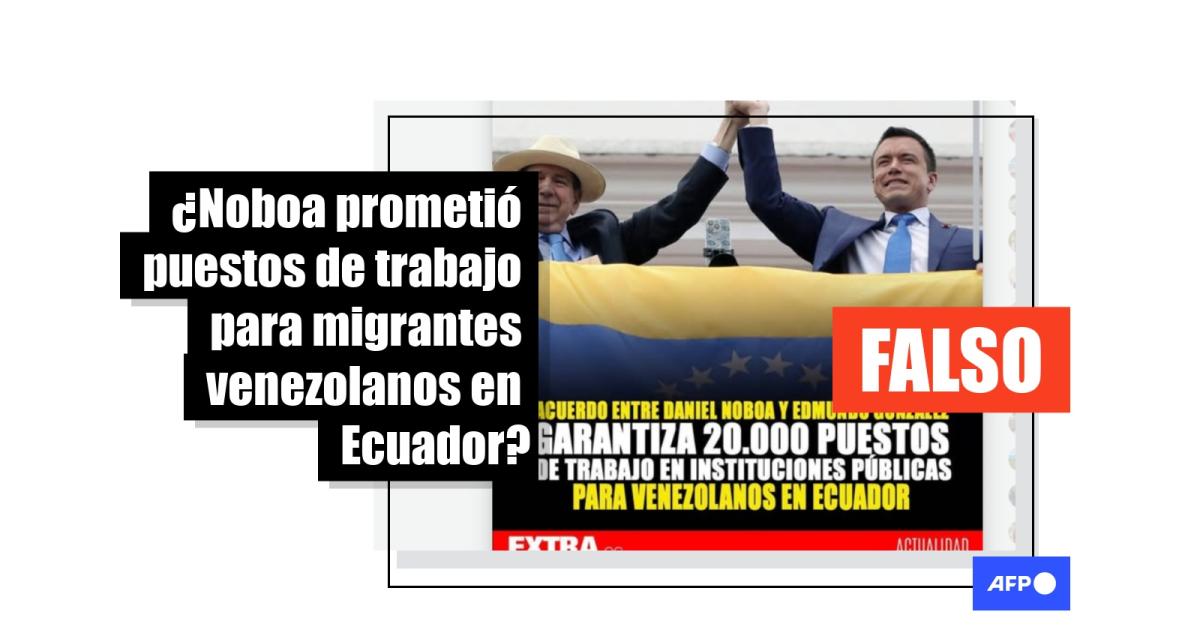 “Acuerdo entre Daniel Noboa y Edmundo González asigna 20.000 plazas de trabajo en instituciones públicas para venezolanos en Ecuador”, se lee en un texto sobrepuesto en una imagen del presidente ecuatoriano y el líder opositor con el logo del medio digital Primicias, compartida en Facebook (1, 2).