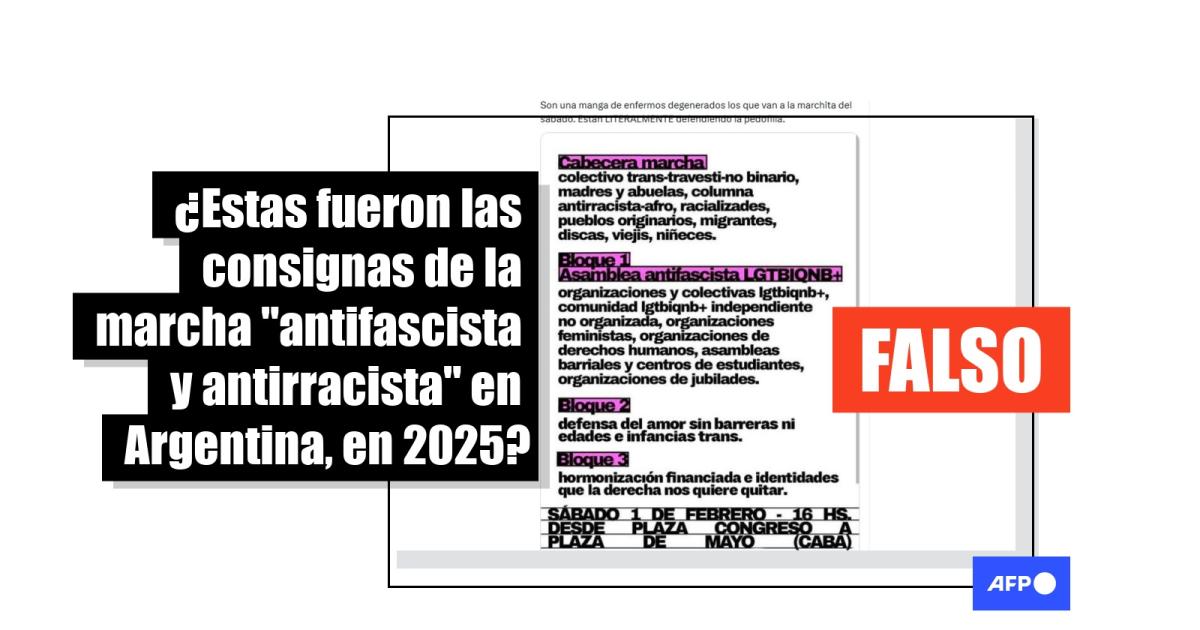 Ese Montenegro, activista trans masculino y militante por los DDHH, quien formó parte de la marcha, confirmó a la AFP que la información que figura en la placa viral es falsa y que la convocatoria oficial “indicaba cómo se distribuía la columna en bloques para que cada espacio supiera dónde marchar”. Esta se podía consultar en la publicación en Instagram de la cuenta oficial de la Asamblea, agregó.