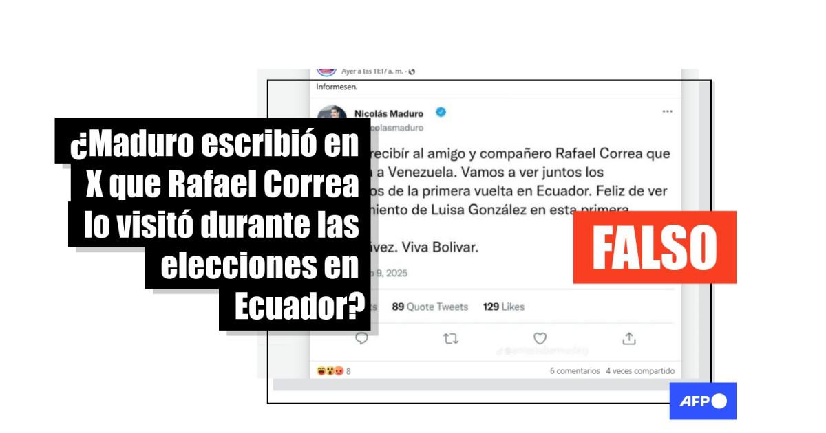 “Feliz de recibír al amigo y compañero Rafael Correa que hoy llega a Venezuela. Vamos a ver juntos los resultados de la primera vuelta en Ecuador. Feliz de ver el rendimiento de Luisa González en esta primera vuelta. Viva Chávez. Viva Bolivar”, se lee en una captura de una supuesta publicación en X de Maduro, compartida en Facebook (1, 2), Instagram y X.