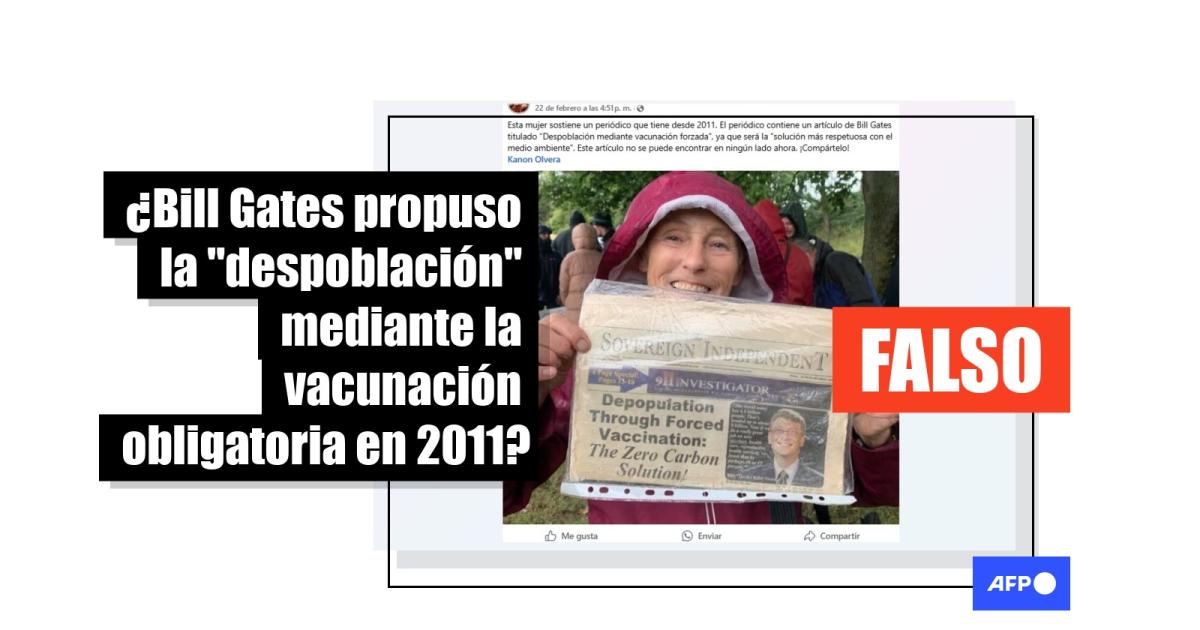 “Mujer sostiene un periódico que conserva desde 2011. El documento contiene un artículo de Bill Gates titulado ‘Despoblación mediante vacunación obligatoria’. Gates cree que sería la ‘solución más respetuosa con el medio ambiente’. Nadie le dio mucha importancia en ese momento”, señalan publicaciones en Facebook (1, 2) y X.