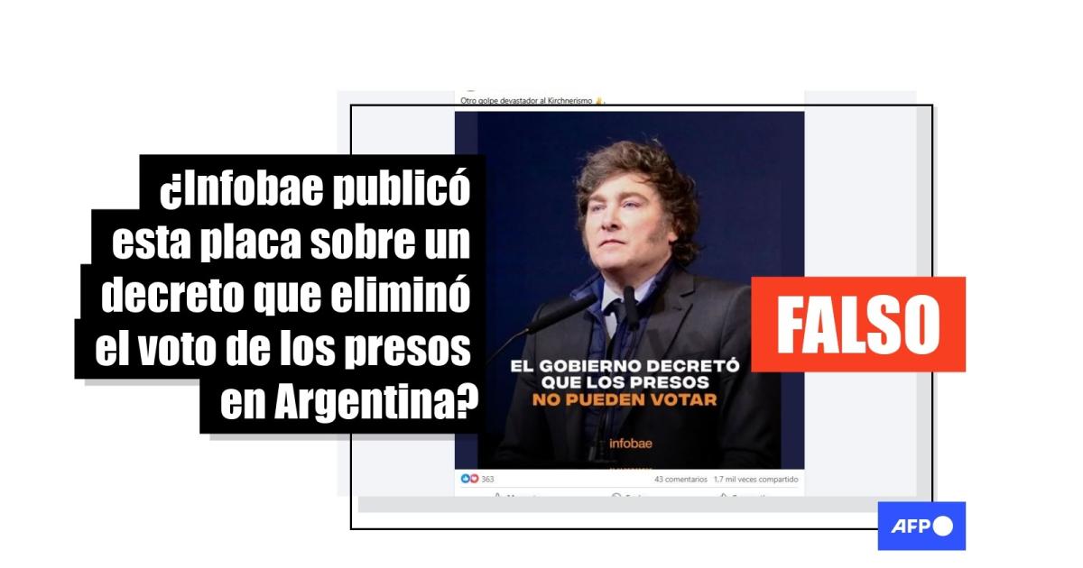 “El gobierno decretó que los presos no pueden votar”, se lee en la supuesta placa atribuida al medio Infobae con una foto del presidente argentino compartida en X, Facebook e Instagram.