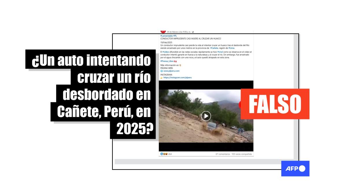 “Conductor imprudente casi muere al cruzar un huaico. 19/feb/2025 un conductor imprudente casi pierde la vida al intentar cruzar un huaico tras el desborde del río siendo arrastrado por unos metros en la provincia de #Cañete, región de #Lima”, señala una publicación en Facebook y TikTok.