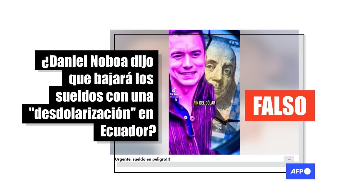 “Urgente, sueldo en peligro. Se viene el fin del dólar en Ecuador. Noboa quiere bajar los sueldos con la desdolarización para beneficiar a su círculo empresarial, los cuales pagarán con una moneda devaluada, recortándote el salario básico y contratando más empleados por la mitad de sueldo”, dice el audio de un video compartido en Facebook (1, 2).