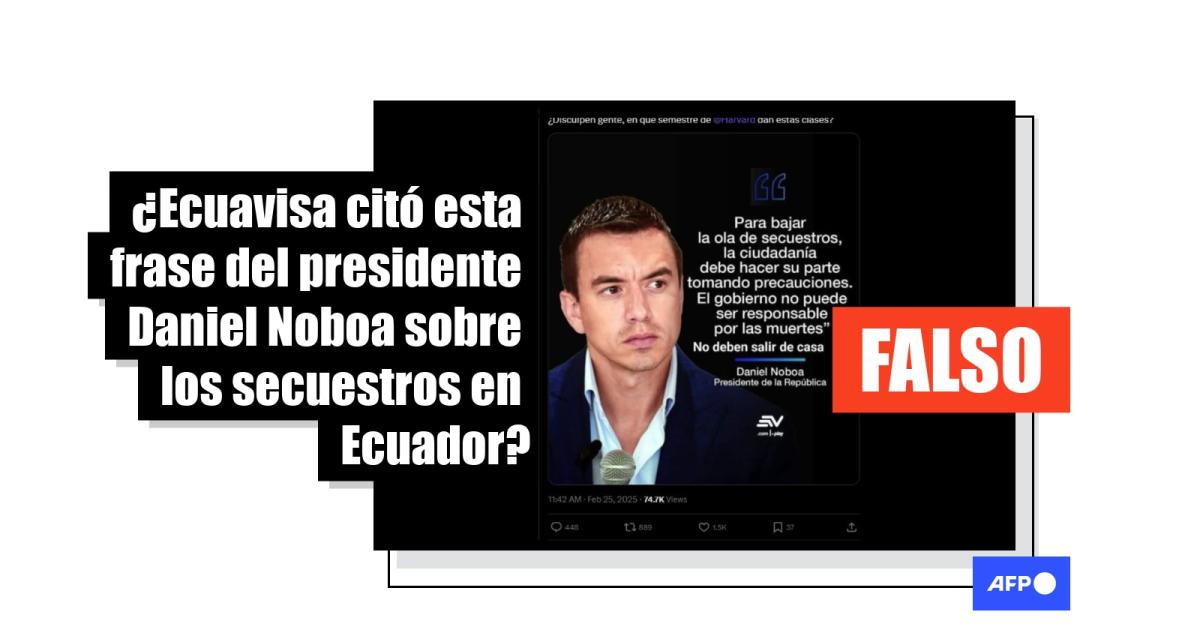 “Para bajar la ola de secuestros, la ciudadanía debe hacer su parte tomando precauciones. El gobierno no puede ser responsable por las muertes. No deben salir de casa”, dice la supuesta cita de Noboa publicada por Ecuavisa y compartida en X y Facebook (1, 2).