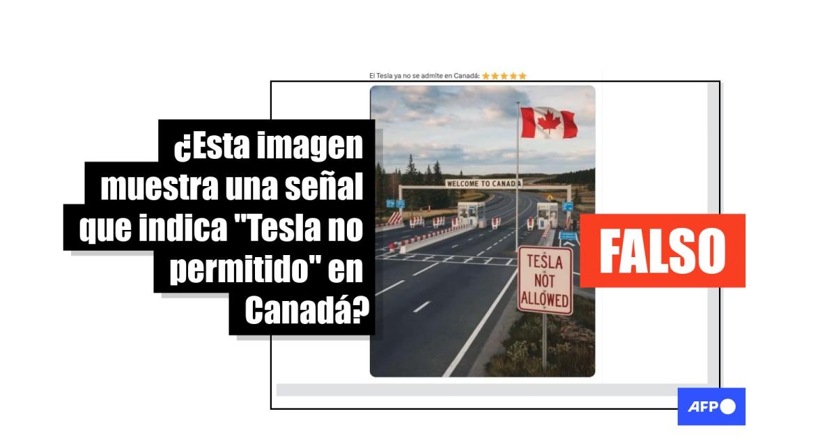 “El Tesla ya no se admite en Canadá”, se lee en una publicación en X junto a una imagen que supone mostrar un puesto fronterizo con la bandera canadiense y al frente una señal de tráfico en la que se indica "Tesla no permitido" en inglés.