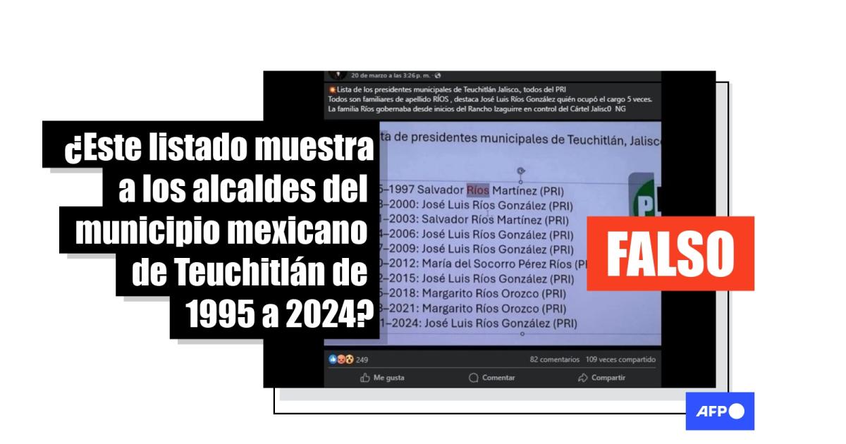 “Lista de los presidentes municipales de Teuchitlán Jalisco., todos del PRI Todos son familiares de apellido RÍOS , destaca José Luis Ríos González quién ocupó el cargo 5 veces. La familia Ríos gobernaba desde inicios del Rancho Izaguirre en control del Cártel Jalisc0 NG (Cártel Jalisco Nueva Generación)”, afirman las publicaciones en Facebook, Instagram, Threads, TikTok y X.