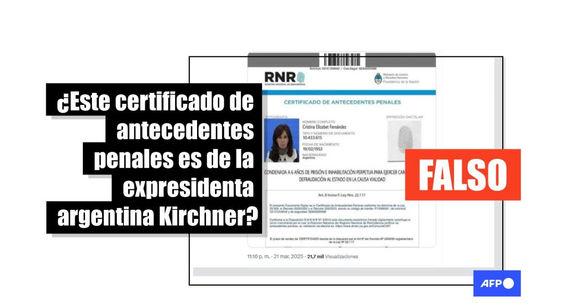 La constancia de antecedentes penales de la exmandataria argentina Cristina Kirchner es un montaje