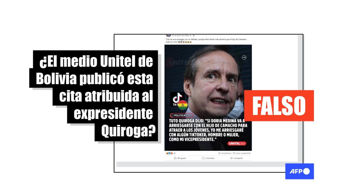 “Tuto Quiroga dijo: Si Doria Medina va a arriesgarse con el hijo de Camacho para atraer a los jóvenes, yo me arriesgaré con algún tiktoker, hombre o mujer, como mi vicepresidente", se lee en una supuesta placa del medio Unitel de Bolivia, compartida en Facebook desde el 25 de abril (1, 2).