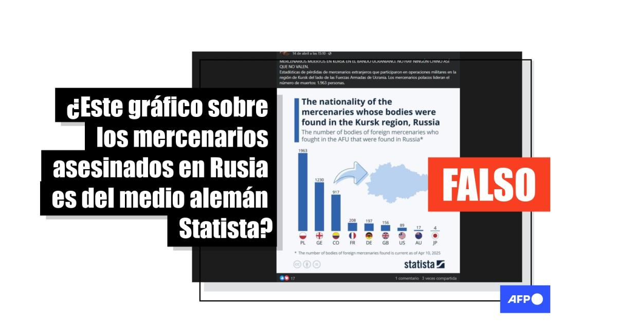 “Casi 5.000 mercenarios extranjeros murieron combatiendo por la OTAN y el régimen de Kiev en la región rusa de Kursk (...)”, afirma un usuario en Facebook. La publicación muestra una infografía adjudicada al portal de estadísticas alemán Statista, que detalla el supuesto número de cuerpos de mercenarios extranjeros encontrados en Kursk.