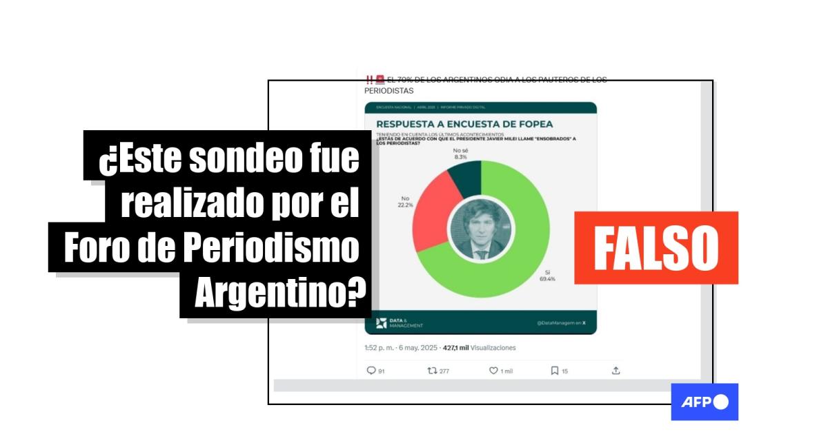 Al revisar sus publicaciones, AFP Factual halló que compartió el contenido viral el 6 de mayo de 2025. “#Encuesta | FOPEA realizó una encuesta cerrada a 65 participantes sobre los dichos del Presidente y decidimos abrir esta encuesta al publico: ¿Estás de acuerdo con que el Presidente Javier Milei llame ‘ensobrados’ a los Periodistas?”, dice la leyenda de la entrada.