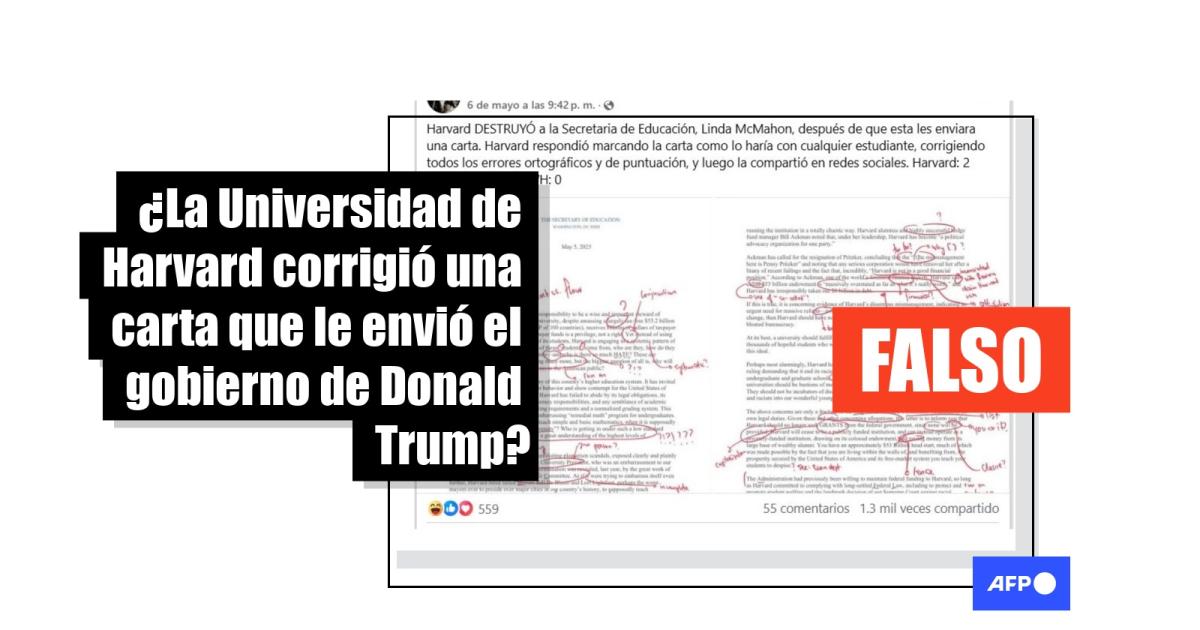 “Harvard DESTRUYÓ a la Secretaria de Educación, Linda McMahon, después de que esta les enviara una carta. Harvard respondió marcando la carta como lo haría con cualquier estudiante, corrigiendo todos los errores ortográficos y de puntuación, y luego la compartió en redes sociales. Harvard: 2 Administrador de WH: 0”, indica una publicación en Facebook acompañada de la carta de McMahon con señalizaciones en rojo.