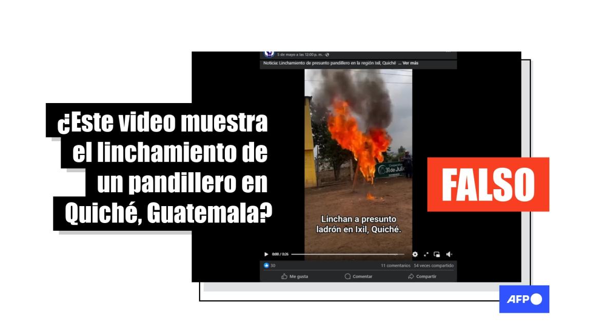 “Noticia: Linchamiento de presunto pandillero en la región Ixil, Quiché IMÁGENES SENSIBLES, SE RECOMIENDA DISCRESIÓN”, comienza la leyenda de una publicación en Facebook, que comparte un video de casi 30 segundos de duración que muestra a una multitud, en la que también hay varios menores de edad, reunida alrededor de una figura en llamas.