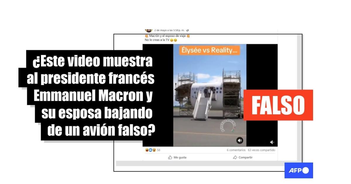 “Macrón y el esposo de viaje. No le creas a la TV”, afirman usuarios en Facebook (1, 2, 3) y X junto con un video donde se ve a Macron y a su esposa bajando de un avión con el logo presidencial. Después se amplía el plano y no hay como tal un avión, sino una parte del mismo, que está sobre un andamio. “Elíseo vs Realidad…”, se lee en francés impreso sobre el video.