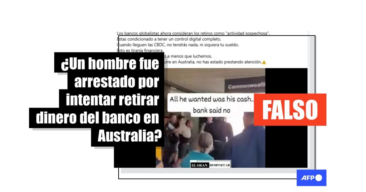 “Australia/Agenda 2030: No tendrás Nada y serás feliz. Un hombre arrestado por intentar retirar su dinero. Un hombre simplemente pidió retirar $5,000 de su propio dinero y el banco llamó a la policía. Fue arrestado por intentar acceder a su dinero. Esto no es un invento. Está es la guerra contra el efectivo y ya está aquí. Los bancos creen que tú dinero les pertenece”, se lee en publicaciones que difunden el metraje en Facebook (1, 2) y X .