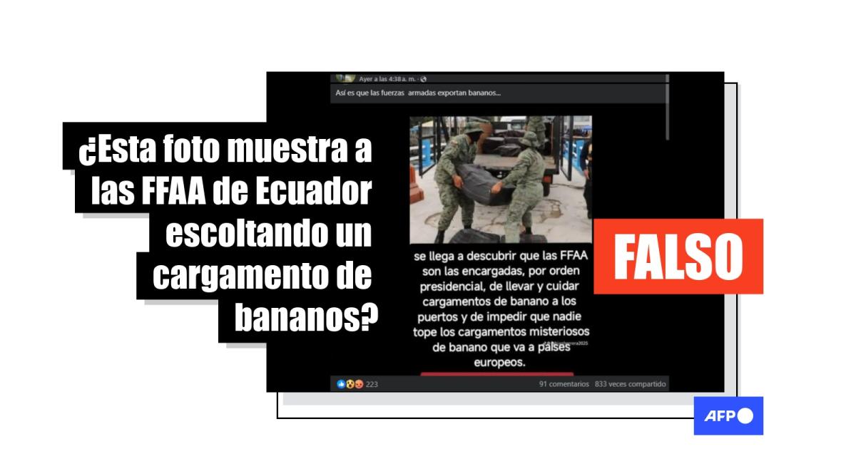 “Se llega a descubrir que las FFAA son las encargadas por orden presidencial, de llevar y cuidar cargamentos de banano a los puertos y de impedir que nadie tope los cargamentos misteriosos de banano que va a paises europeos”, dice el texto compartido en Facebook (1, 2), X y TikTok, que acompaña la imagen de dos militares cargando paquetes negros.