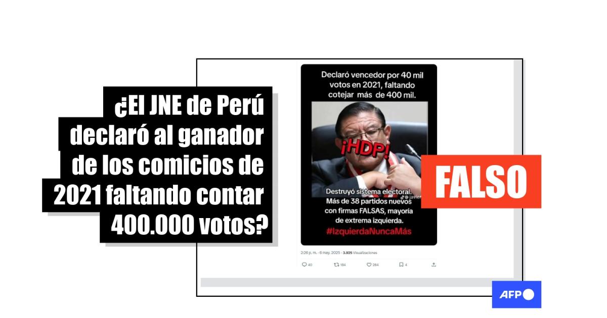 En junio de 2021, Perú eligió a Pedro Castillo como presidente de la República. Cuatro años después, en junio de 2025, usuarios en redes sociales han compartido cientos de veces la afirmación de que el Jurado Nacional de Elecciones (JNE) proclamó ganador al exmandatario cuando faltaban por cotejar 400.000 votos. Sin embargo, el acta que declaró su victoria muestra que se computaron el 100% de los sufragios, luego de resolver las impugnaciones presentadas.