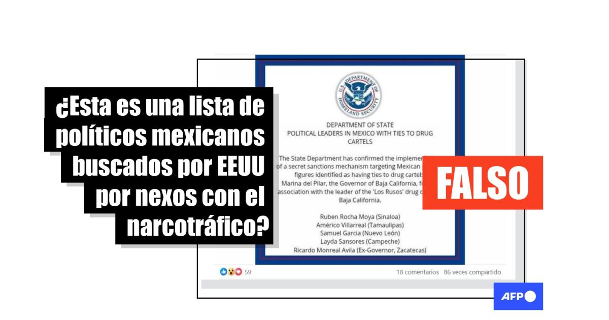 “LÍDERES POLÍTICOS EN MÉXICO CON VÍNCULOS CON CÁRTELES DE LA DROGA. El Departamento de Estado ha confirmado la implementación de un mecanismo secreto de sanciones que apunta a figuras políticas mexicanas que tienen nexos con cárteles de la droga”, señala una imagen en inglés con el logo del Departamento de Seguridad Nacional de Estados Unidos publicada en Facebook.