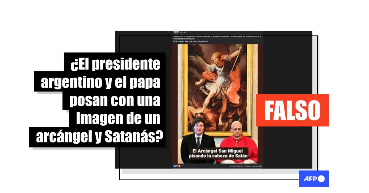 “Cuadro del Arcangel San Miguel, pisando la cabeza de satanás y el Papa León de testigo junto al Sr Presidente de la Nación. Una imagen vale más que mil palabras”, dice un usuario en Facebook en referencia a la ilustración, enmarcada en dorado, que parece mostrar a un ángel que pisa la cabeza de un demonio encadenado y le apunta con una espada.