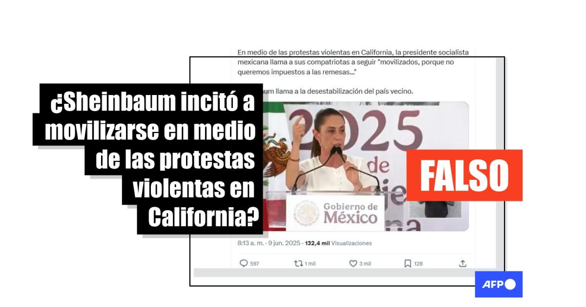 “En medio de las protestas violentas en California, la presidente socialista mexicana llama a sus compatriotas a seguir ‘movilizados, porque no queremos impuestos a las remesas...' Sheinbaum llama a la desestabilización del país vecino”, señala una publicación en X junto a un video de Sheinbaum.