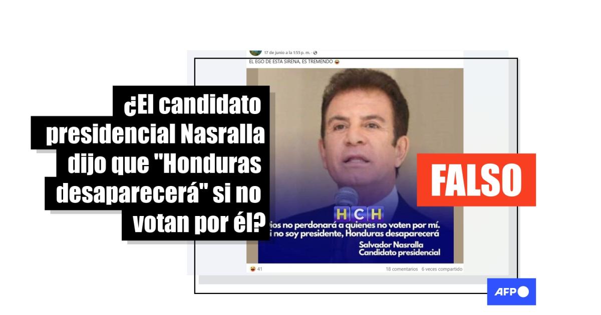 “Dios no perdonará a quienes no voten por mí. Si no soy presidente, Honduras desaparecerá”, señala una supuesta cita de Nasralla, que incluye su foto y el logo de la cadena televisiva Hable Como Habla (HCH), difundida en Facebook (1, 2).